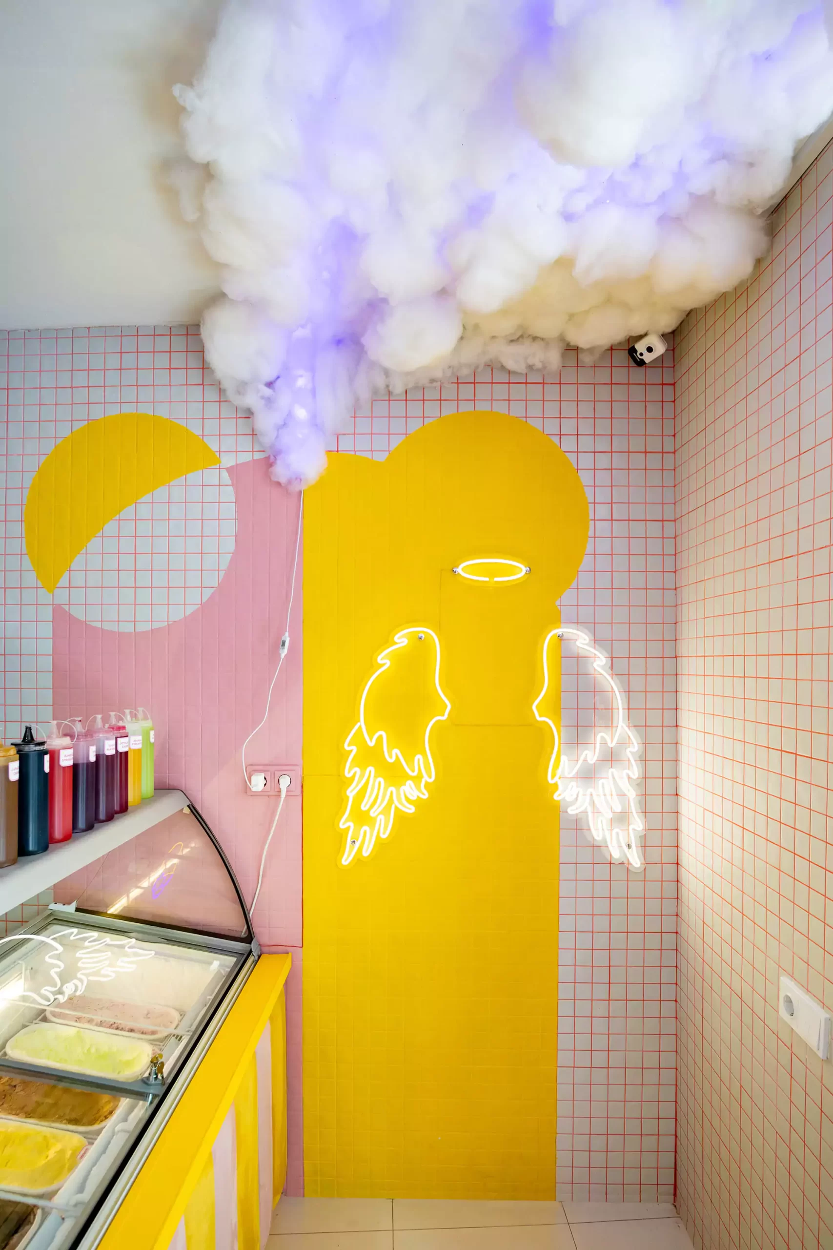 განსაკუთრებული დეტალია ჭერზე განთავსებული დეკორატიული „ღრუბლები“ და კედლის ნეონის ინსტალაცია (ანგელოზის ფრთები), რაც ინტერიერს „ინსტაგრამულს“ ხდის და მომხმარებლის ჩართულობას ზრდის.
