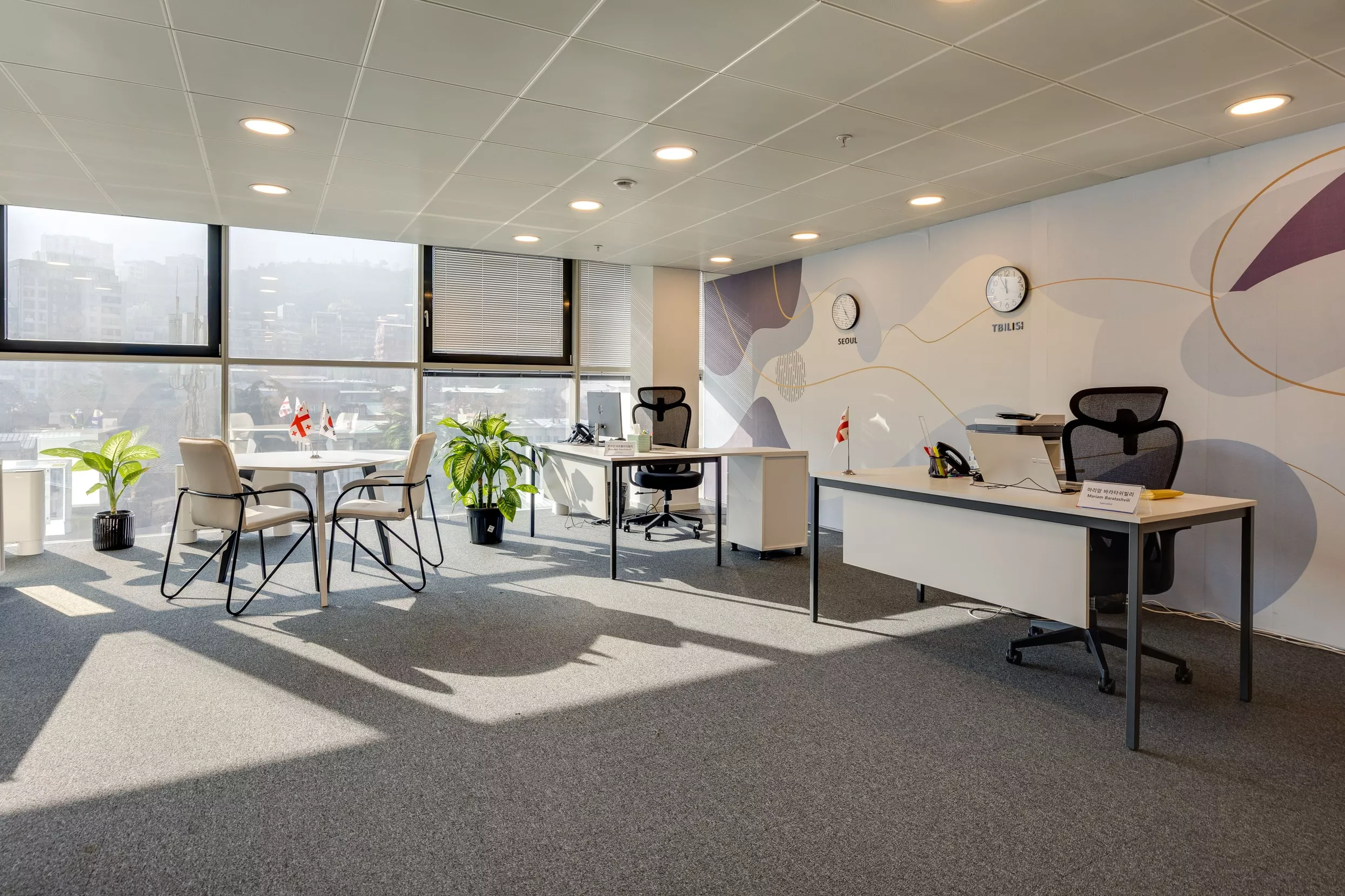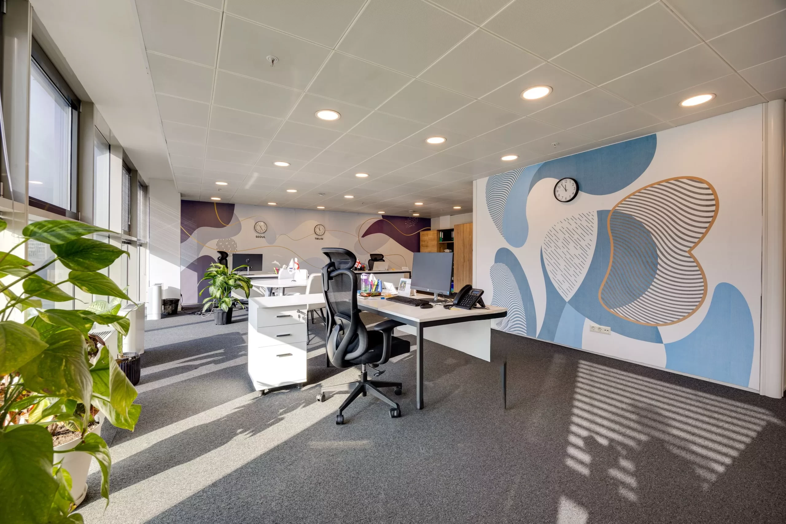 კედლის გრაფიკა: სპეციალურად ამ პროექტისთვის შეიქმნა კედლის მოხატულობა აბსტრაქტული ფორმებით, რომელიც არბილებს ოფისის მკაცრ ხაზებს და სივრცეს უფრო ცოცხალს ხდის.