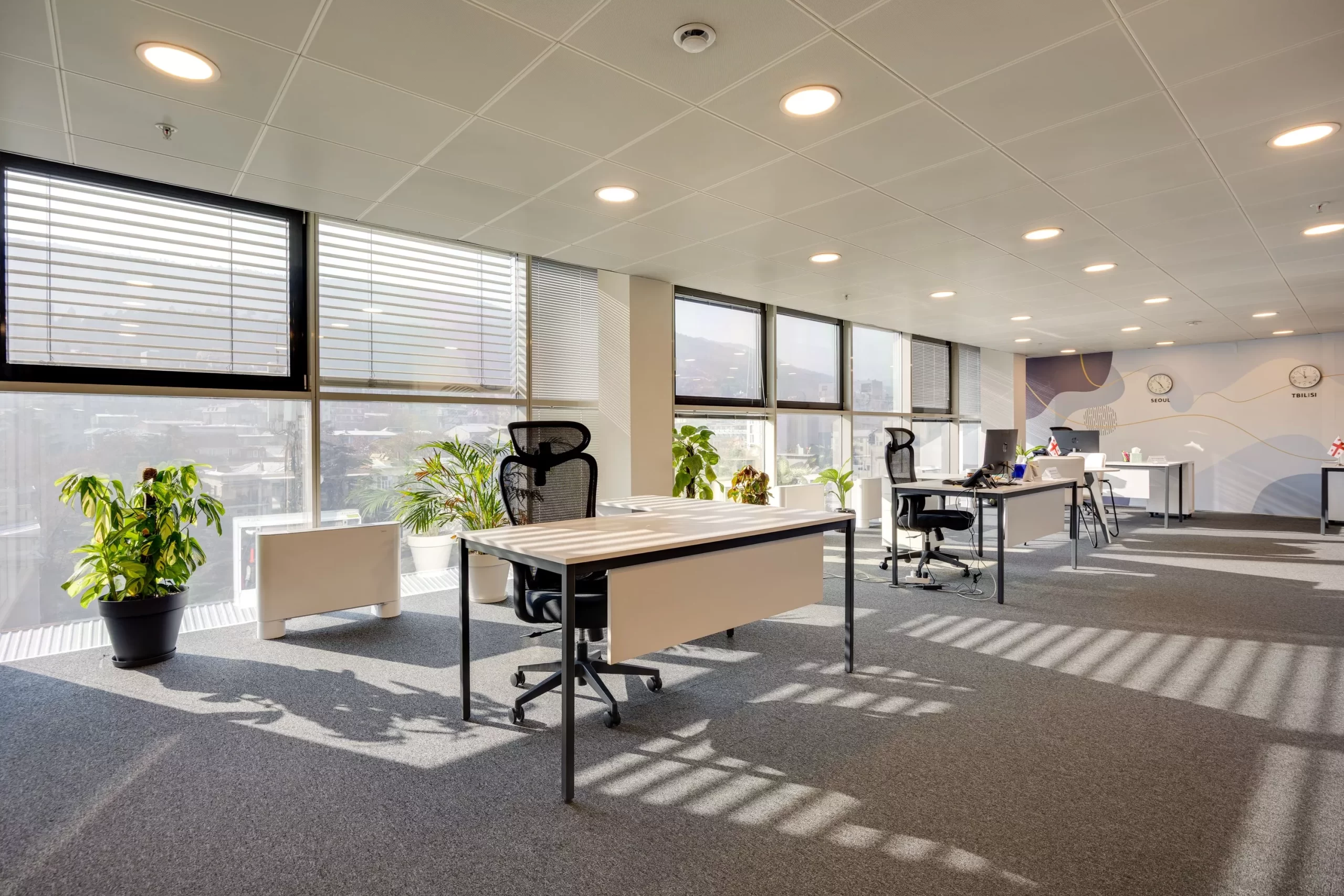 ღია სამუშაო სივრცე: აქცენტი გაკეთდა ბუნებრივ და ხელოვნურ განათებაზე (4000K), რაც თვალს არ ღლის და მუშაობისთვის ოპტიმალურ პირობებს ქმნის.